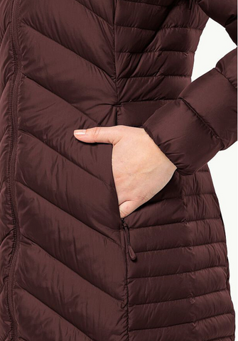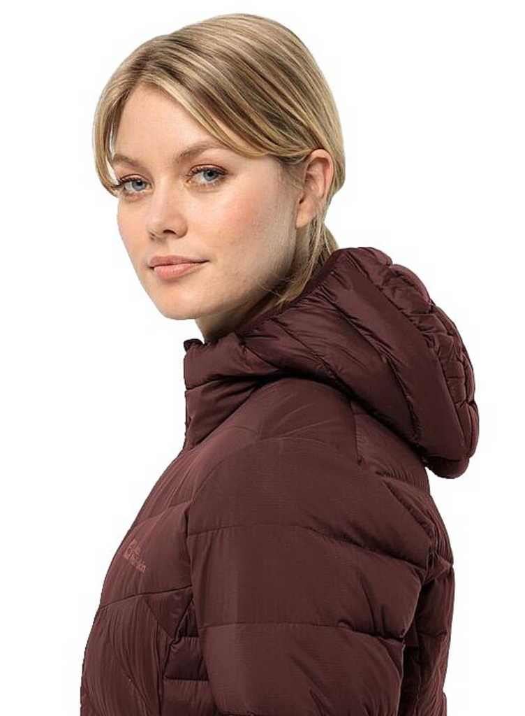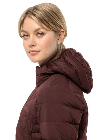 Der Jack Wolfskin Damen-Daunenmantel bietet eine hervorragende Kombination aus Leichtigkeit, Wärme und zuverlässigem Wetterschutz. Das Außenmaterial besteht aus TEXASHIELD PRO REUSED/RECYCLED LITEWEIGHT, einem recycelten Polyamid-Gewebe, das winddicht, sehr wasserabweisend und gleichzeitig atmungsaktiv ist. Ergänzt wird es durch Einsätze aus Texashield Pro Paper Touch, die dem Mantel eine hochwertige Haptik verleihen.