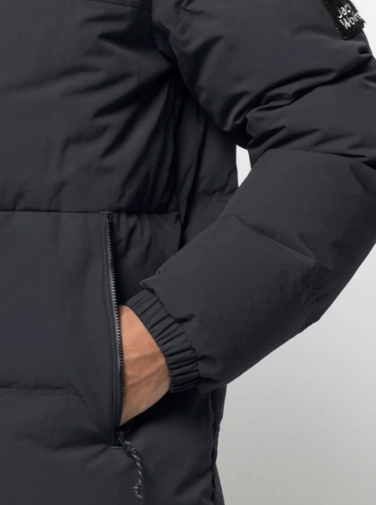 Diese Jack Wolfskin Herren-Daunenjacke in klassischem Schwarz vereint Wärme, Wetterschutz und einen modernen, urbanen Look. Die Jacke ist modern geschnitten und bietet dadurch eine sportliche, zeitgemäße Passform, die sowohl im Alltag als auch bei Outdoor-Aktivitäten überzeugt.
